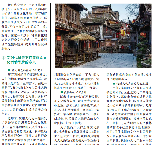 群众文化活动在新时代背景下扮演着重要角色,不仅为人们提供了娱乐和社交 的机会,而且有助于当下的文化传承和社会凝聚。打造新时代群众文化活动品牌,可 以增强群众对文化活动的认可度和参与度,为构建文明和谐社会贡献力量。