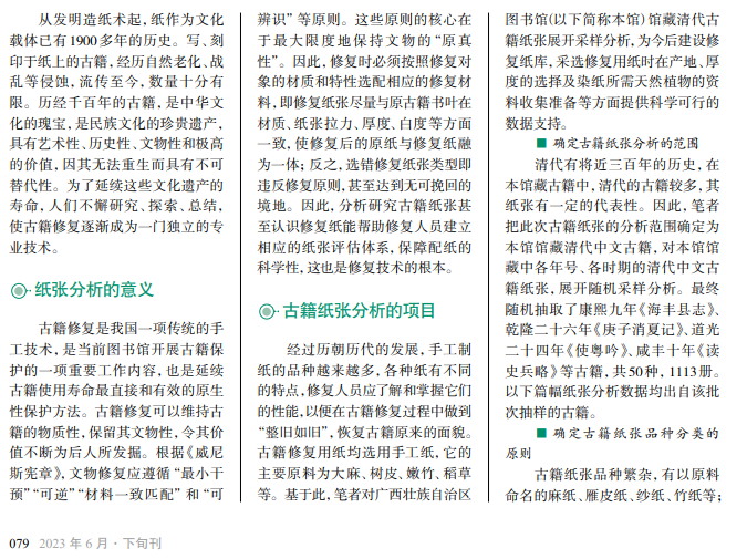 本文从纸张分析的意义 出发,对广西壮族自治区图 书馆部分馆藏清代文献展开 检测分析,确定分析的项目 内容和范围,并从酸度、白度、 厚度以及纸张纤维检测文献 纸张,得出馆藏清代文献纸 张破损状况、文献纸张类型 等,为建设省级古籍保护中 心修复纸库奠定基础。