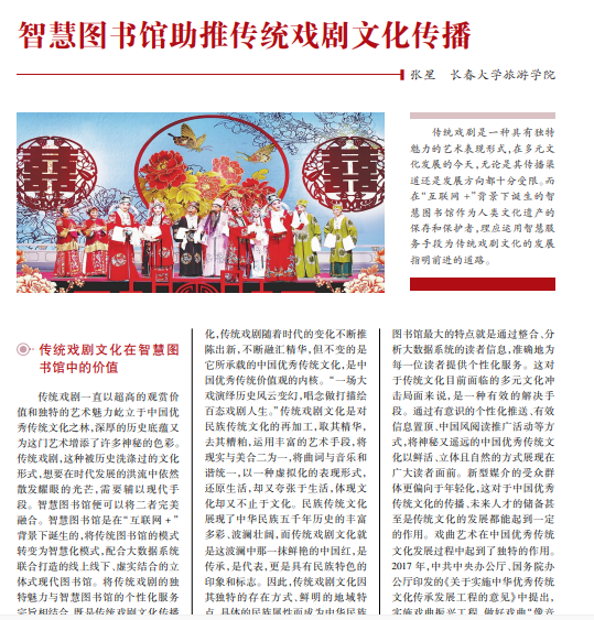 传统戏剧是一种具有独特 魅力的艺术表现形式,在多元文 化发展的今天,无论是其传播渠 道还是发展方向都十分受限。而 在“互联网 +”背景下诞生的智 慧图书馆作为人类文化遗产的 保存和保护者,理应运用智慧服 务手段为传统戏剧文化的发展 指明前进的道路。