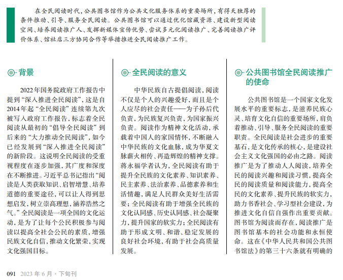 在全民阅读时代,公共图书馆作为公共文化服务体系的重要场所,有得天独厚的 条件推动、引导、服务全民阅读。公共图书馆可以通过优化馆藏资源、建设新型阅读 空间、培养阅读推广人、发挥新媒体宣传优势、尝试多元化阅读推广、完善阅读推广评 价体系、馆社店三方协同合作等举措推进全民阅读推广工作。