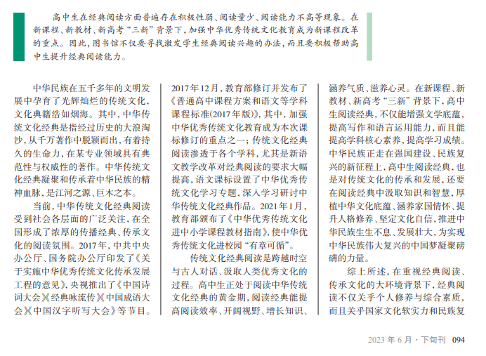 高中生在经典阅读方面普遍存在积极性弱、阅读量少、阅读能力不高等现象。在 新课程、新教材、新高考“三新”背景下,加强中华优秀传统文化教育成为新课程改革 的重点。因此,图书馆不仅要寻找激发学生经典阅读兴趣的办法,而且要积极帮助高 中生提升经典阅读能力。