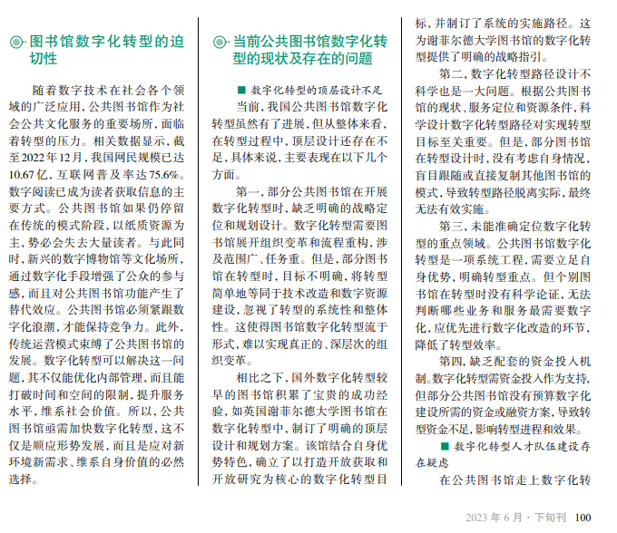 在数字技术高速 发展的背景下,公共图 书馆亟需推进数字化 转型,数字化转型是公 共图书馆应对新形势、 体现自身价值的必然 选择。图书馆需正视 转型中存在的困难与 不足,持续推进数字化 进程,全面提升服务质 量和公共影响力。