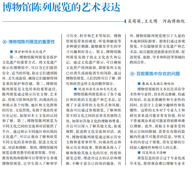 博物馆展览是文化传承和 保护的载体与窗口,承载着历 史文物、艺术品、民俗文化等人 类文明的珍贵遗产,为社会公 众提供了文化和社交空间。观 众可以从展览中汲取灵感,探 索不同的艺术形式和创作方 法,了解和欣赏各种文化的美 和价值,促进文化的传承和保 存。因此,博物馆应注重完善 展陈方式,发挥自身展览功能 和教育功能。