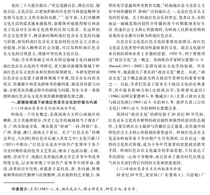 岭南红色音乐文化从产生、发展、传播至今,音乐形态、文化内涵和社会功能发生了巨大改变,但其传播方 式没有跟上新媒体的发展速度。本研究将岭南红色音乐文化置于新媒体视域下审视,结合音乐内容及形式、传播媒介 和受众群体等传播因素,阐释解读其价值与内涵,分析其传播过程中的困境与问题,旨在寻求一条促使岭南红色音乐文 化有效传播和健康发展之路。