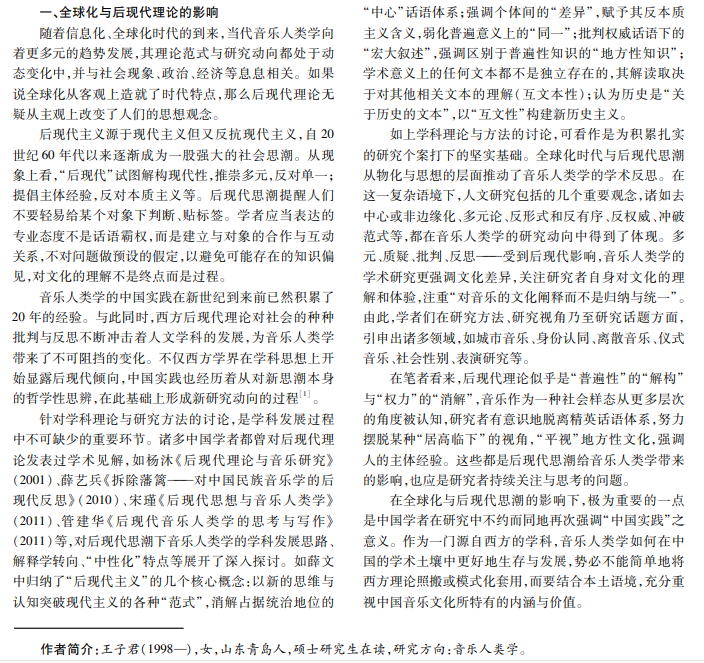 1980年,南京艺术学院召开了“全国民族音乐学学术讨论会”,亦称“南京会议”,由此拉开了音乐人类学 的中国实践序幕。如今,中国的音乐人类学已迈入“不惑”之年。在过去的 40年中,不同学术背景的学者基于不同 理解与视角,作出了大量学术实践。实践成果的丰富充分说明了这门学科的魅力及其对国内学界的影响力。