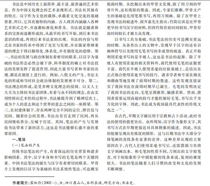 笔法是书法艺术的核心,其内涵丰富。在传统书法史上,笔法是书法传承中不可或缺的一环,它使书法创 作呈现出系统的状态。法度的确立,使文人对意趣产生更高追求。法度与意趣之间既有联系,又有区别,如果拘泥于法 度,就会失去意趣,而只有接近规律,才能获得意义。笔法体系的出现,让古代和现代的书法家冲破了时间的枷锁,彼此 相连,成为书法史的根基,传承了书家的精神和意志,让书法的内涵得到了持续发展。