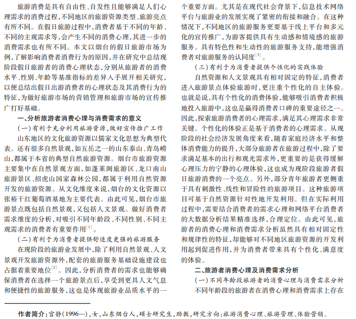 现阶段,假日旅游已经成为生活消费的重要组成部分。假日旅游消费心理和消费需求与本地区的旅游文 化、旅游资源紧密相关。分析消费者的消费心理和消费需求,有利于明确地区长期的旅游宣传推广目标,并通过加强 旅游文化建设和旅游资源完善性建设,更好地满足消费者消费心理和消费需求。本文有针对性地分析了烟台地区不 同年龄段消费者的消费心理,研究影响其消费需求和行为的因素,为烟台假日旅游市场开发建设提供依据。
