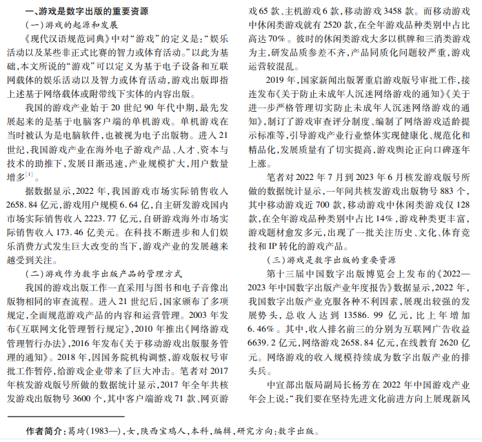 随着政府引导、行业自律、产业进步、跨界融合,游戏产品开始在教育、科技、文化、科普等方面彰显多元化 的社会价值。出版工作者需要跟上快速变化的技术发展和市场需求,充分认识到游戏跨界融合的巨大可能性以及 游戏与出版行业深度融合发展的必要性,积极推动其与相关产业的融合与发展,为文化产业注入新的活力。本文围 绕游戏出版的发展和游戏产品愈发多样性、创意性的变化,探讨精品游戏在互联网新时代的出版价值。