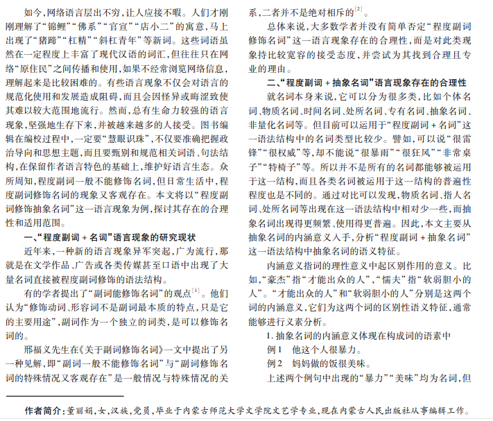 编辑在图书编校过程中会遇到很多不符合传统语法规范的表述,其中有一些是语法错误,也有一些属于现 代汉语范畴内新出现的语法现象,有其存在的合理性。编辑要提高对这类语言现象的甄别能力,合理处理稿件中遇到 的相关问题。本文以程度副词修饰抽象名词这一语言现象为例,从语言事实出发,认真考察这种既非普遍又非个别的 现象,以期为图书编辑的编校工作提供借鉴。