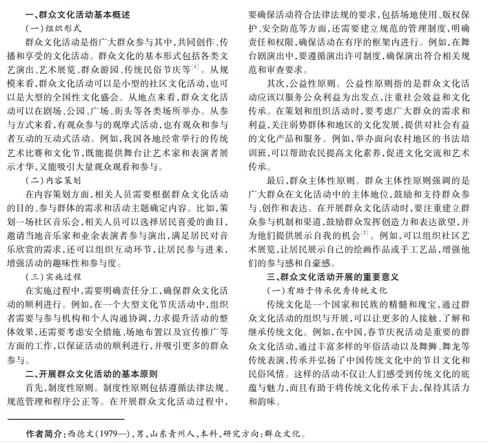 本文分析了群众文化活动对推动社会发展和文化繁荣的积极作用,通过研究群众文化活动的组织形式、内 容策划和实施过程,总结出有效的参与方法和推动因素,并提出了促进群众文化发展的建议。研究结果表明,群众文化 活动的组织与开展是多方面因素综合作用的结果,需要政府、社会组织和个人共同参与、形成合力,才能推动群众文化 的发展。