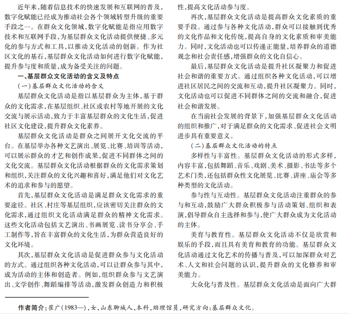 近年来,基层群众文化活动在社会发展中发挥着不可忽视的作用。这些活动激发群众文化兴趣、提升群众 文化素养,对促进社区和谐、传承民族文化、推动文化创新意义重大。然而,受传统形式的限制,基层群众文化活动在参 与度、传播效果和可持续发展等方面还面临着诸多问题。本文旨在探究数字化赋能对基层群众文化活动的影响与作 用,通过应用数字化技术,为基层群众文化活动带来新的机遇与活力。