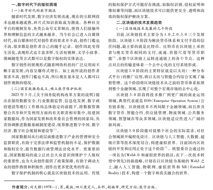 21世纪是数字经济时代,数字产业化和产业数字化已成为中国经济增长的重要力量。与数字经济高速发 展相悖的是数字作品版权保护力度不够。传统数字版权由于烦琐的手续和滞后的信息差,已跟不上时代的脚步。知信 链作为新兴的技术保护手段,以“去中心化”“可溯源”“不可更改”“智能合约”等,为保护数字版权提供了新思路,成为 数字经济下版权保护新机制。