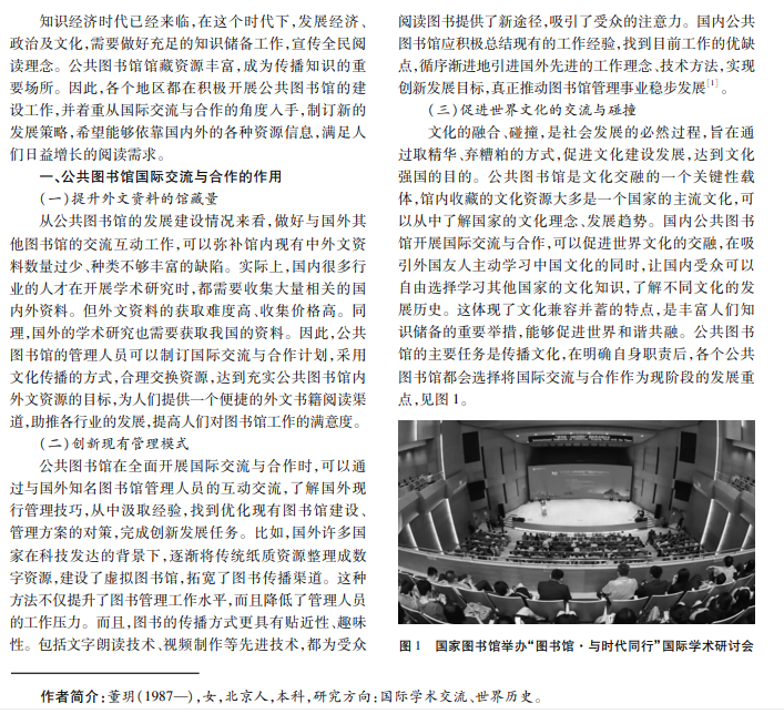 传统的公共图书馆存在资源种类少、资源共享效果不佳的问题,容易导致图书资源利用率下降,无法发挥 图书的使用价值,也无法为受众提供优质的图书服务。为解决这些发展难题,本文探究公共图书馆的国际交流与合作, 介绍这种合作方案对充实馆藏量、创新管理模式、促进世界文化交融以及推进公共图书馆国际化发展进程的重要作用, 并探讨开展合作的必要准备工作以及创新合作思路的可行方案。