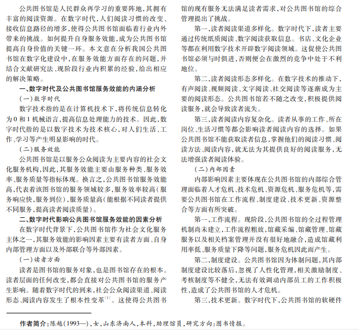 本文对数字时代的公共图书馆服务效能内涵、数字时代对公共图书馆服务能力的影响等展开研究,认为公 共图书馆的服务效能受读者信息、内部和外部因素的影响,在此基础上结合文献研究法与相关经验,提出数字时代提升 公共图书馆服务效能的对策。