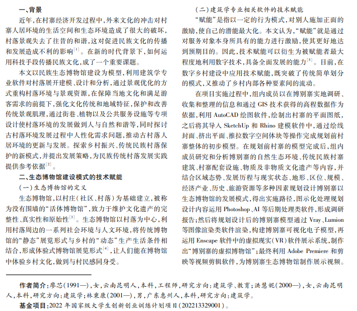 文章以云南省普洱市江城哈尼族彝族自治县国庆乡么等村博别寨为研究对象,通过村落建筑信息模型 (技术赋能)方法完成了对古村落建筑修复改造工程的数字化应用。建立古村落的三维模型,能够还原街巷空间,实现 可视化空间感知;将田野调查信息与村落三维模型相结合,以建筑学的分析方法,采用生态博物馆的模式对规划开发 以博别寨为代表的古村,可以形成生态文明背景下发展民族地区经济社会的新思路、新模式,促进民族地区生态文明 建设。