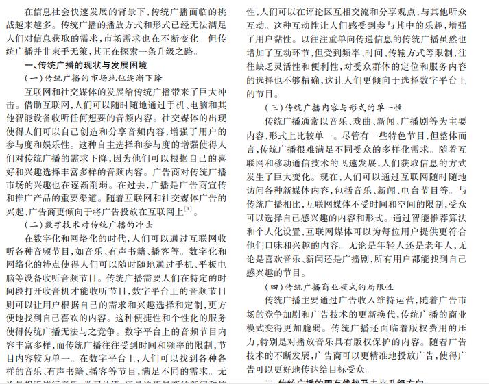 随着科技的不断进步,传统广播面临着突破与革新的挑战。在过去的几十年里,广播一直是人们获取信息 和娱乐的重要方式之一。随着互联网和智能手机的普及,人们的收听习惯和需求发生了巨大转变。为适应这种变化, 传统广播需要升级,结合新兴技术为听众提供更好的服务。