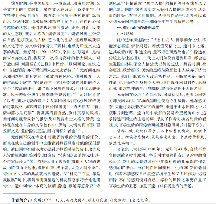 遗山词受魏晋名士的影响很深,其词具有魏晋风神,具体表现在隐逸、借酒消愁、慕道情怀、仪态举止、独立 人格等五方面。究其根本原因,是遗山对儒家思想的坚守。