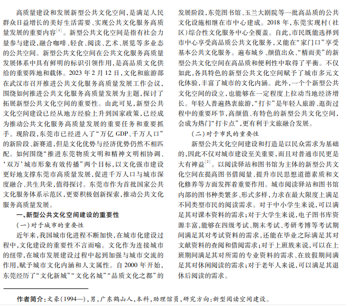 进入“十四五”以来,我国公共文化服务迈向高质量发展阶段。国家、省级层面纷纷将新型公共文化空间 建设写入重要政策文件。东莞市作为一个人口超千万的超大城市,应在注重经济建设的同时,在新型公共文化空间建 设方面积极探索。本文以东莞市为例,分别从新型公共文化空间建设的重要性、东莞市新型公共文化空间建设实践、未 来东莞市新型公共文化空间建设探索三个方面研究分析,以期为东莞市新型文化空间建设提供创新思路和参考。