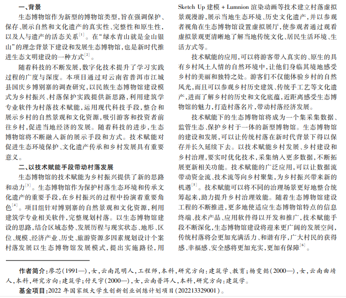 本文以云南省普洱市江城县国庆乡博别寨为例,探讨对生态博物馆的技术赋能方式,并从其应用方式、乡 村振兴、未来发展等方面展开分析。基于习近平总书记提出的“绿水青山就是金山银山”理念,以生态博物馆建设模式 为乡村振兴、村落保护实践发展新思路,利用建筑学专业软件为村落展开建模、设计和分析,探索云南民族村落的振兴 途径,对促进生态环境保护、文化遗产传承和乡村振兴具有重要意义。