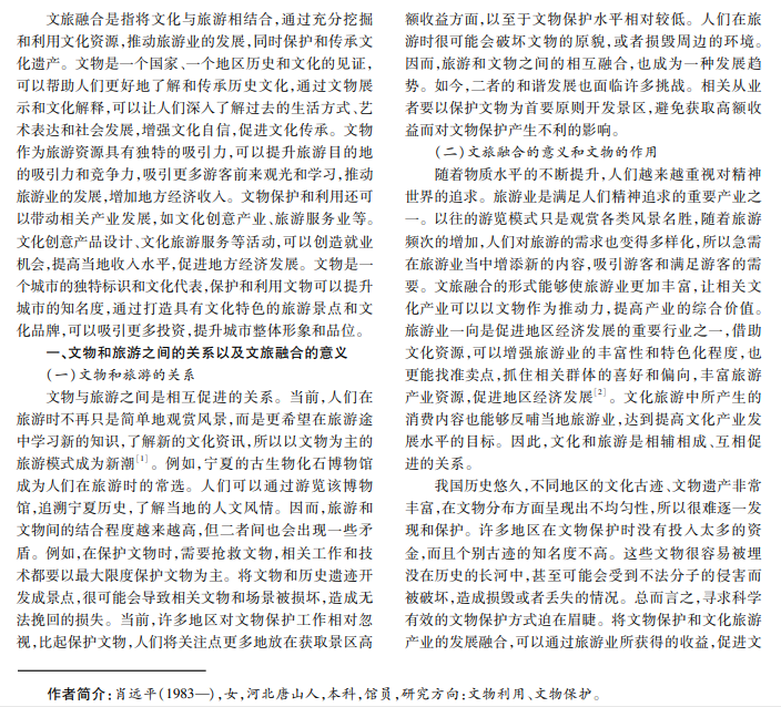 随着社会经济的快速发展,人们的生活水平有了极大提升,开始寻求精神层面的富足。许多人借助旅游满 足精神需求,在旅游过程中,经常会参观当地博物馆,了解当地的历史与文化故事,丰富个人的内心世界。本文从文旅 融合的时代背景出发,分析文物保护和利用的相关工作,希望人们关注与文物保护相关的工作内容,并意识到文物保护 与利用的重要性。