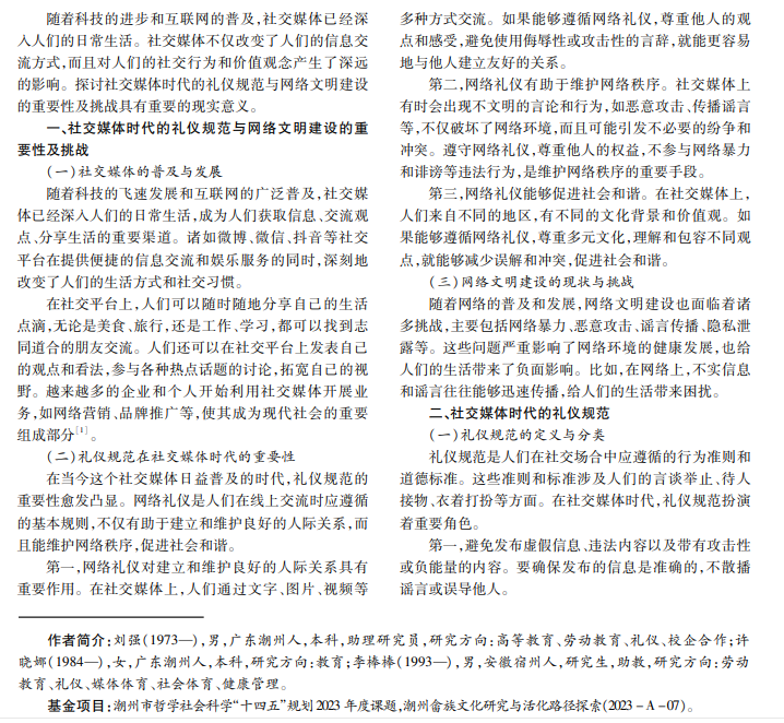 本文介绍礼仪规范在社交媒体时代的重要性,分析网络中关于网络暴力、恶意攻击、谣言传播、隐私泄露等 现状问题与挑战,提出加强网络素养教育、加强网络法律法规建设、倡导网络文明传播以及加强企业与平台的社会责任 等措施,希望推动礼仪规范与网络文明建设协同发展。
