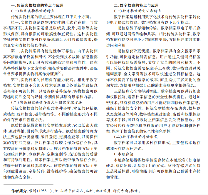 在信息时代背景下,传统实物档案与数字档案的共存与发展备受关注。传统实物档案是指以纸质、胶片等 实物形式存在的档案资料,数字档案是指以电子形式存储和传输的档案资料。随着信息技术的飞速发展,数字档案在 存储、检索、传输和共享等方面呈现出巨大的优势,给传统实物档案带来日益严峻的挑战。