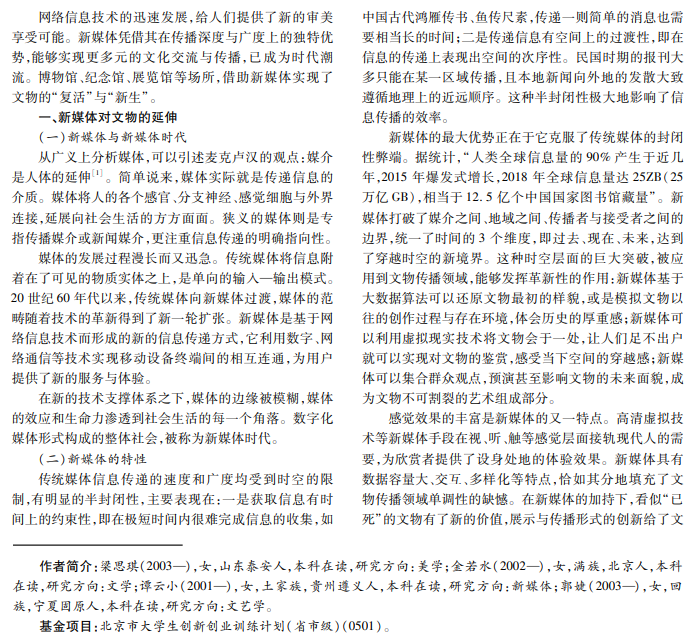 近年来的文创实践表明,文物通过新媒体手段提升了自身的吸引力。由新媒体延展的新形式,使得文物欣 赏的话语权转向每个个体。由此,文物真正贴近大众生活、走入现实。新媒体赋能下,大众接触文物的方式更加灵活, 一定程度上消解了审美“屏障”,不同层次的受众均受到文物与新媒体带来的潜在美学影响,这是兼具传统文化内涵与 当代价值导向的独特创造。
