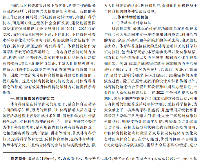 体育博物馆作为国家科普教育的重要场所之一,有着独特的科普方式、科普内容、科普理念。体育博物馆 真实的历史文物、丰富的体育知识、丰厚的体育文化精神,对增长体育知识、弘扬体育精神、提高体育思想境界有着明显 的效果与价值。本文分析体育博物馆科普功能的定义与价值,探究提升体育博物馆科普功能的举措。