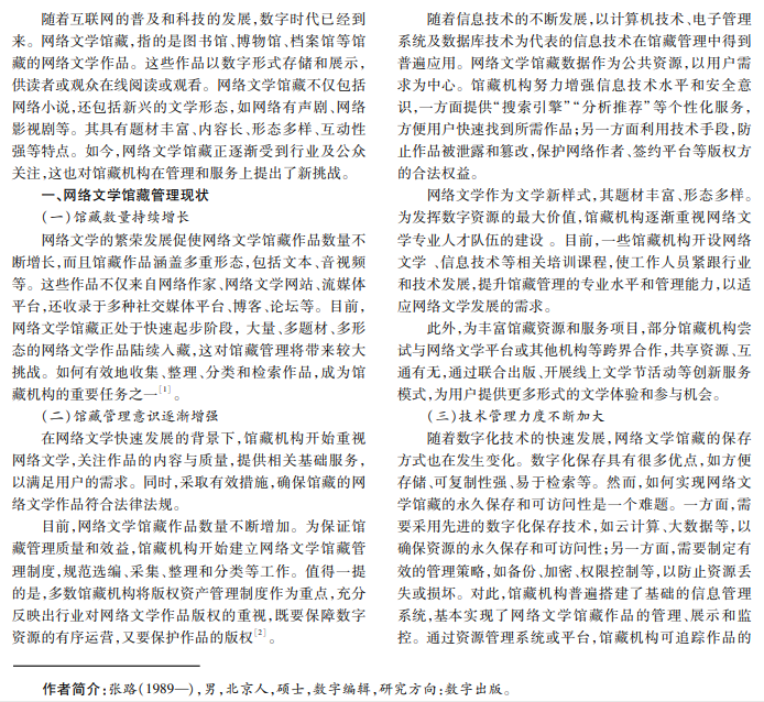 随着科技的飞速发展和数字化时代的到来,网络文学作为新兴的文学形式,已经深入日常生活。网络文学 馆藏作为数字资源的重要组成部分,既包含了丰富的文学创作,又体现了现代科技成果。如何有效地管理和利用网络 文学馆藏,以充分发挥其价值,是值得深入研究的问题。本文探讨数字时代下网络文学馆藏管理的应用,以期为相关研 究和实践提供参考借鉴。
