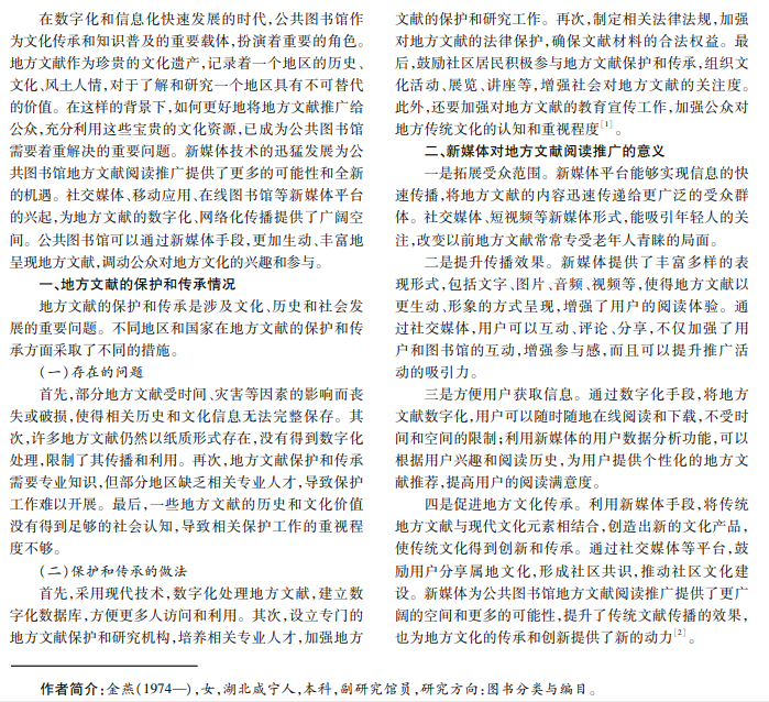 本文从新媒体视角出发,探讨公共图书馆地方文献阅读推广的意义、方法。深入研究如何运用社交媒体、 移动客户端等新媒体工具,制定互动性强、参与度高的地方文献推广措施,推动地方文献的深入挖掘和广泛传播。本研 究旨在为公共图书馆地方文献阅读推广提供有益的启示和建议,推动地方文献的传承与发展,促进社区文化建设的繁 荣与进步。