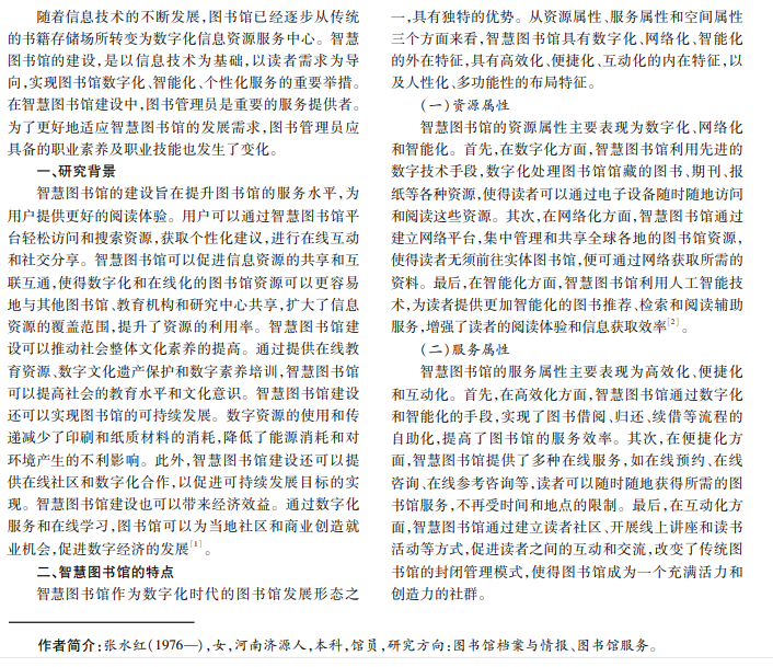 随着信息技术的发展和智慧图书馆的兴起,高职院校图书管理员的职业角色和技能要求也发生了变化。 本文从智慧图书馆的特点入手,探讨高职院校图书管理员的角色转变。在此背景下,高职院校图书管理员需要具备一 系列职业素养和职业技能,包括信息素养、服务意识、创新能力、沟通能力、组织协调能力等,还需要具备数字化资源管 理、信息咨询与引导、教育培训、文献检索与利用等专业技能。