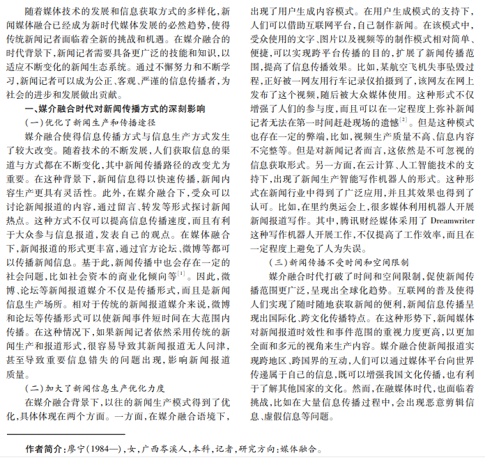 在媒介融合语境下,新闻记者的角色面临着巨大转变,这对新闻记者的专业素养和能力提出了更高的要 求。本文从媒介融合时代对新闻传播方式的深刻影响入手,分析了媒介融合语境下新闻记者角色要求以及优化的重要 性,并探讨新闻记者角色的转变途径,旨在为新闻行业的转型和发展提供借鉴。