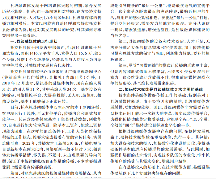 针对当前县级融媒体存在的问题,本文提出从加强技术赋能升级和运营队伍素质提升两个方面入手,寻求 突围之路,尽快改变现状,走出困境,实现县级融媒体传播力的提升。