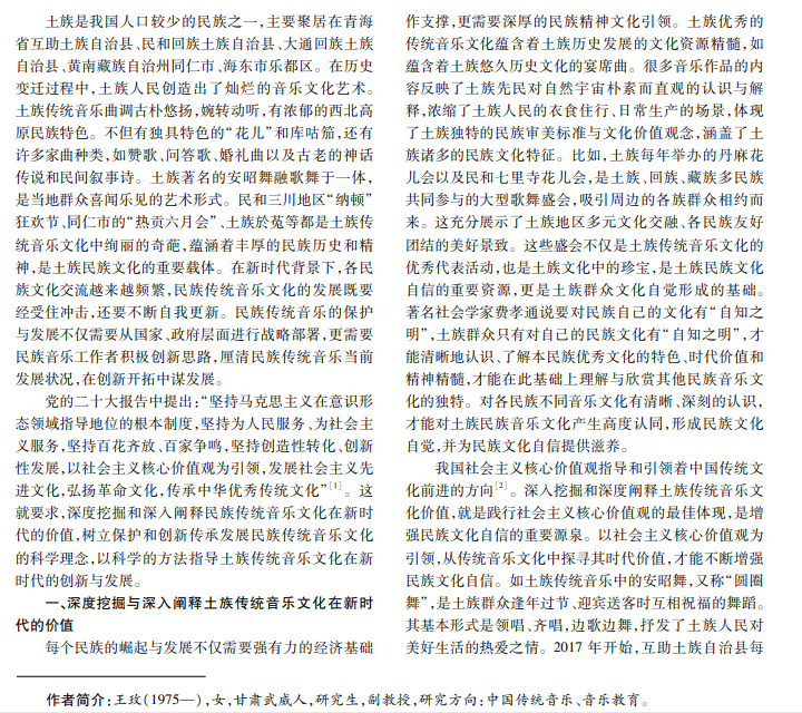 文化自信是新时代各民族文化发展的持久力量。在当代土族传统音乐文化的保护传承与创新性发展中, 要坚持以文化自信为价值引领,深度挖掘并阐释土族传统音乐中所蕴含的新时代价值,用科学的态度认识土族传统音 乐文化,用科学理念服务于土族传统音乐的传承与创新性发展,合理建构创新性发展的实践路径,为其进一步发展夯实 基础;同时,要激发土族传统音乐文化的创作活力,多层次、全方位地推动土族传统音乐文化传承与创新。