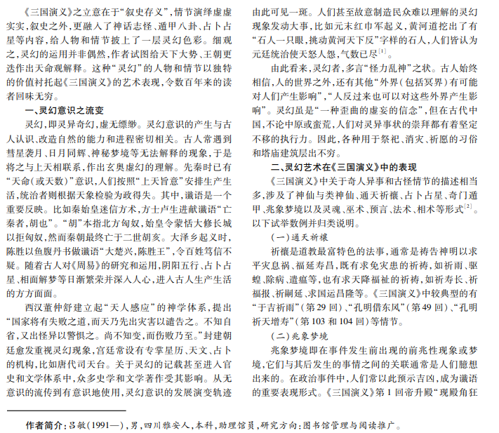 《三国演义》虚实两线并行,使其演义趣味极强。《三国演义》虚写处更是充满艺术虚构和奇幻想象。在这 方面,灵幻色彩的运用是一个显著标志。对于这种艺术色彩,早有部分论著通过个别典型人物或某些典型情节阐述其 神秘性,但鲜有专文系统论述其具体表现和艺术价值。这一艺术特色可以成为研究《三国演义》及类似古典小说的重 要方向,因此,本文探讨古代灵幻意识之流变以及《三国演义》中灵幻色彩的具体体现及其艺术价值,为读者解读《三国 演义》提供借鉴。