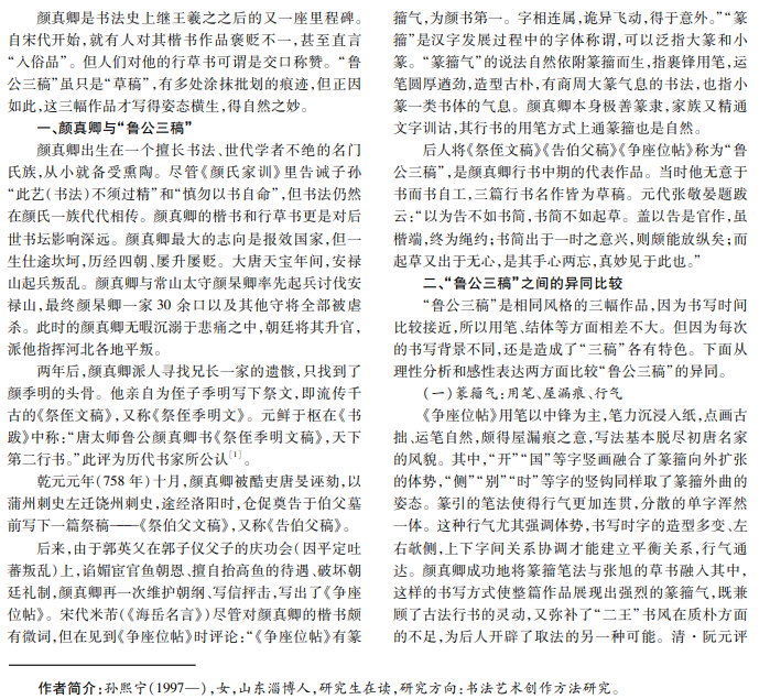 “鲁公三稿”是颜真卿行书中具有代表性的作品,其中丰富的笔法与体势改变了唐初书家都效仿王羲之的 书学现象,在书法史上有举足轻重的地位。本文从“鲁公三稿”的书写背景入手,从情感表达与理性认识两方面对比分 析《祭侄文稿》《告伯父稿》《争座位帖》三稿,并系统比较“三稿”与颜真卿其他行书(《裴将军诗帖》)的风格异同,力求 在对颜书的学习中有所进益。