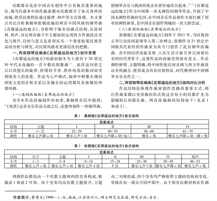歌曲《在那遥远的地方》是由王洛宾根据哈萨克等民族民歌改编的,此曲充满西部风格且传唱度高,因此 被许多作曲家改编。本文以桑桐和张朝两位作曲家据此歌曲改编的两首不同风格的钢琴曲为例,通过对比两首曲子的 结构、材料发展、和声等诸多元素,分析作曲家运用西方作曲技法与民族风格结合的创作形式。
