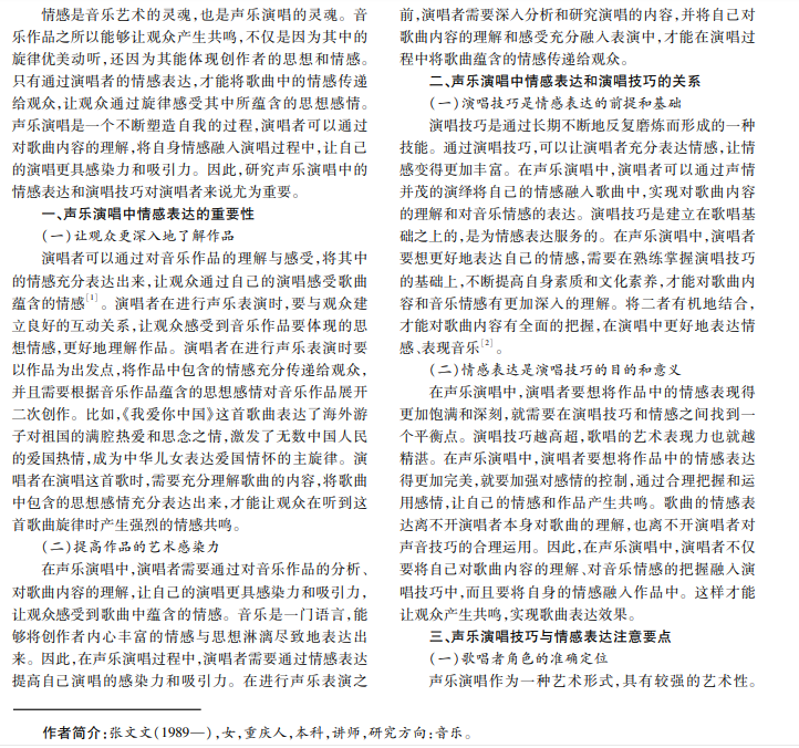 声乐演唱作为技巧性较强的综合性艺术形式,需要演唱者具备良好的演唱技巧,通过对作品内容的理解, 在演唱过程中融入自身的情感,以取得良好的演唱效果。
