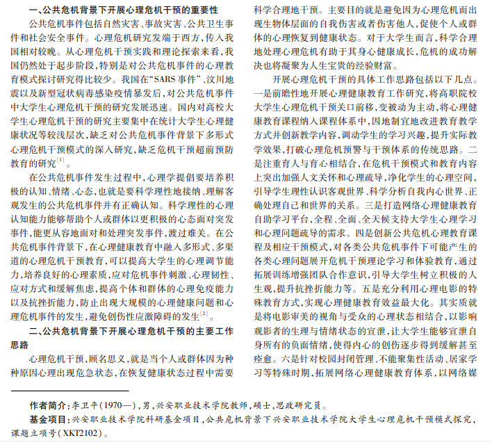 在公共危机事件频繁发生的背景下,高校需要在心理健康教育中融入多形式、多渠道的心理危机干预教 育,提高大学生的心理调节能力,培养其良好的心理素质,提高个体和群体的心理免疫能力及抗挫折能力。本文从拓宽 心理健康教育的多渠道、多角度、多形式入手,研究增强大学生自我心理保健意识和心理危机预防意识的模式,通过现 多形式培养自我认知能力、人际沟通能力、自我调节能力,以切实提高大学生的心理素质,促进学生全面发展。
