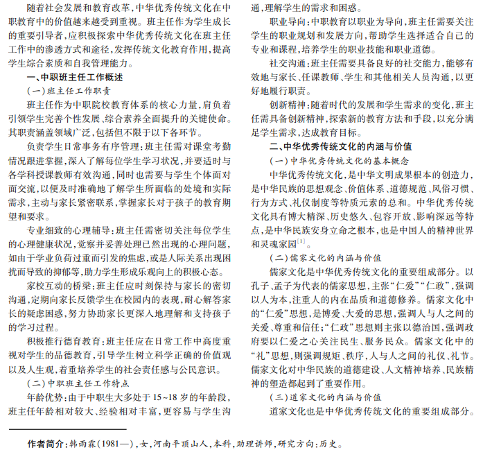 本文研究中华优秀传统文化在中职班主任工作中的渗透,探讨传统文化在班级管理、学生引导和家长沟通 等方面的具体应用。本文认为,中华优秀传统文化的渗透可以丰富学生文化知识,增强学生文化自信和民族自豪感,提 高学生综合素质和自我管理能力,并且有助于提高班主任工作质量和效率,推动中职教育健康发展。