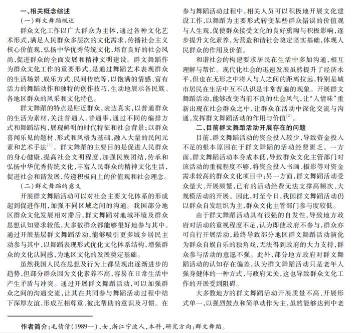 基层群众舞蹈活动是群众文化活动的重要组成部分,其能够丰富群众的日常生活,提高群众的审美水平, 满足群众的精神文化需求。本文简要介绍群文舞蹈的概念及其意义,分析目前基层群众舞蹈活动中存在的问题,最后 提出解决问题的有效路径。