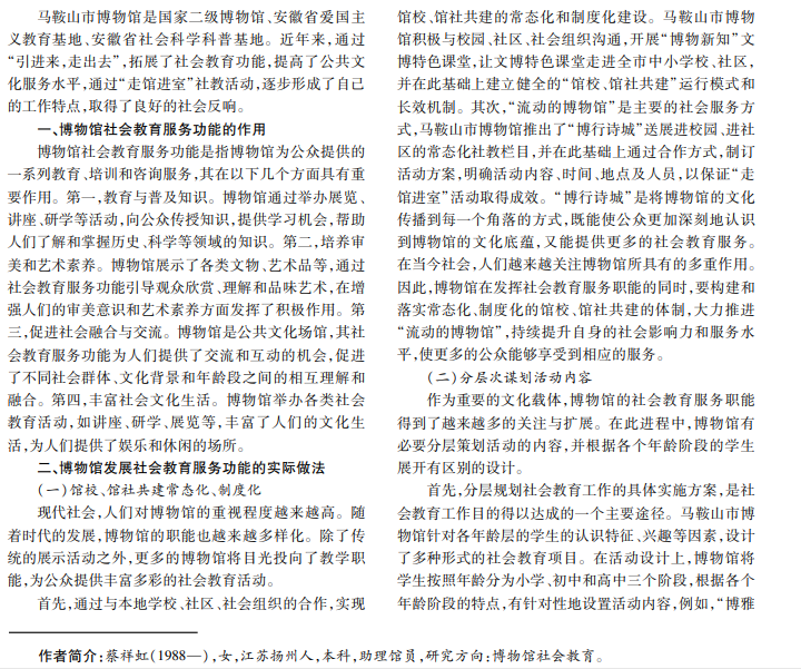 博物馆作为重要的文化机构,在社会教育服务方面扮演着不可或缺的角色。博物馆不仅是传承历史文化、 呈现艺术精品的场所,而且是重要的社会教育平台。马鞍山市博物馆以“弘扬优秀文化、立足公共服务、打造文化亮 点”为发展目标,策划开展丰富多彩的专题展览和社会教育研学活动。基于此,本文分析博物馆社会教育服务功能,探 讨博物馆发展社会教育服务功能的实际做法和经验。