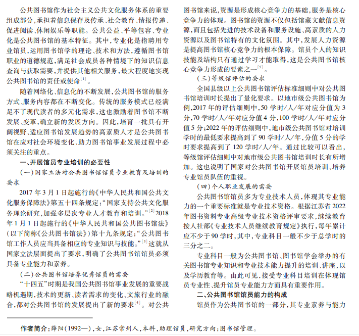 在网络化、信息化时代,公共图书馆正朝着智慧化、信息化发展,这对馆员能力提出了更高要求。为促进图 书馆事业高质量发展,公共图书馆应培育一批视野开阔、专业素养高、与时俱进的优秀馆员。本文从培养规划、培养方 式、培训内容等方面提出公共图书馆馆员培养策略。
