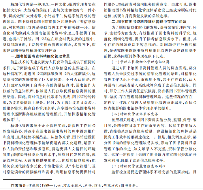 图书馆加强图书资料精细化管理体系建设,能够提升信息服务质量,促进内部管理的制度化、标准化、规范 化发展。本文以推动图书馆转型发展为目的,采取文献分析等方法研究图书馆图书资料精细化管理体系建设,并结合 问题分析策略,提出相关参考建议。