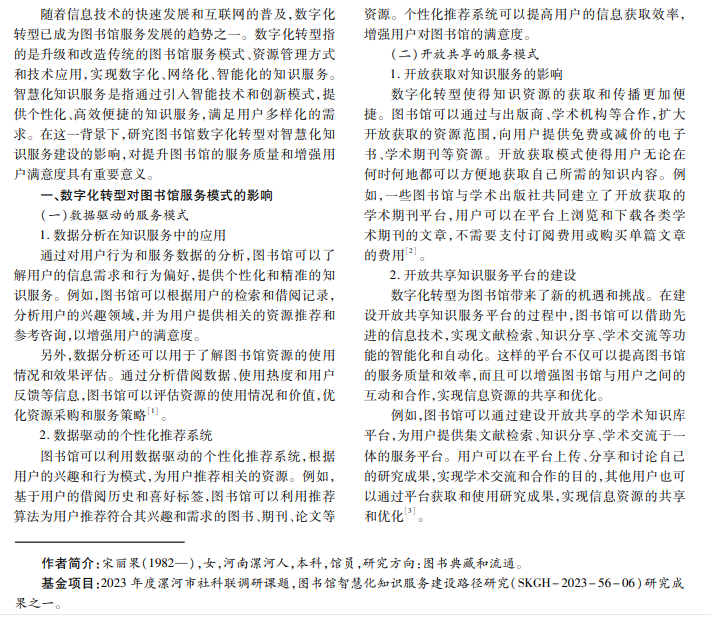 随着数字技术的快速发展和应用,图书馆正处于数字化转型的浪潮之中。数字化转型对图书馆的影响不 仅限于资源基础和技术应用,而且涉及图书馆智慧化知识服务建设。智慧化知识服务建设是指利用人工智能、大数据 分析、云计算等技术手段以及智慧化设备和平台,提供个性化、智能化、高效化的知识服务。数字化转型对智慧化知识 服务建设产生了深远的影响,推动了图书馆的转型发展。本研究旨在探讨图书馆数字化转型对智慧化知识服务建设的 影响。