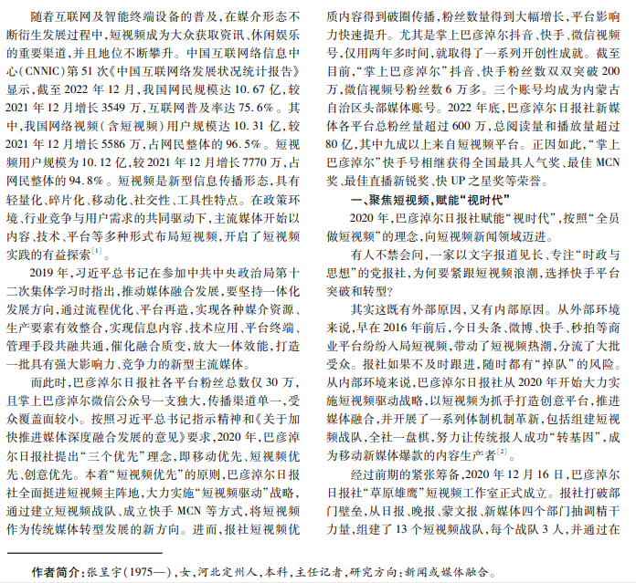 推动媒体融合发展、建设“四全”媒体是摆在媒体面前的一项紧迫课题。近年来,巴彦淖尔日报社积极探 索媒体融合发展之路,实行“三个优先”战略,取得了长足发展。尤其在短视频赛道,巴彦淖尔日报社因势而谋,乘势而 上,从短视频驱动到短视频优先,再到全员短视频,从散点式、零敲碎打式的创新到全面整体推进,实现了以“现象级爆 款产品”为牵引、带动党媒转型融合发展的预设目标,为日报社纵深融合发展闯出新路。
