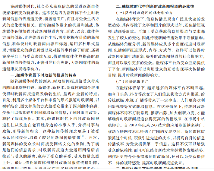 融媒体是传统媒体与新媒体的融合,以新形式满足受众多元化的信息需求。在新时代背景下做好时政新闻 报道,成为媒体人需要深入思考和探索的问题。本文分析融媒体背景下时政新闻报道的特点,指出时政新闻报道传播面临 的机遇,并在此基础上,提出几点关于时政新闻报道传播的有效策略,旨在发挥融媒体优势,提高时政新闻报道的传播力。