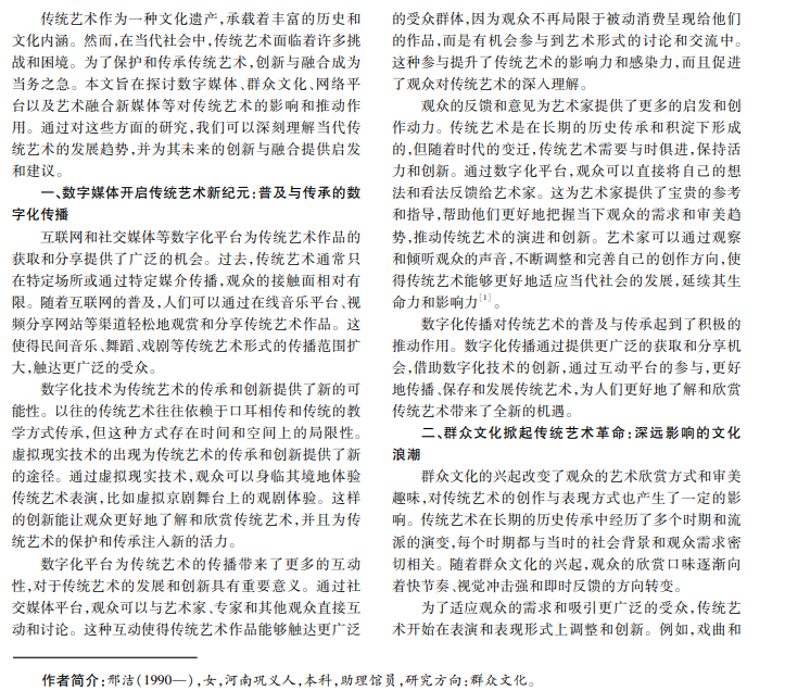 本文探讨传统艺术在当代的创新与融合。数字化传播使得传统艺术更广泛地被人们接触并了解。群众文 化的兴起对传统艺术产生了深远影响,群众参与和创造性的表达方式使得传统艺术焕发出新的生命力。网络平台的出 现使得观众与传统艺术之间建立起更紧密的互动关系,观众可以通过网络平台参与传统艺术的创作和表演。艺术融合 新媒体成为一种趋势,多元化表达方式引领着传统艺术的新风潮。