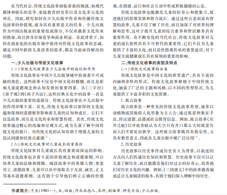 随着现代化进程的推进,年轻一代的价值观逐渐发生变化。传统文化故事作为中国文化的珍贵遗产,对培 养儿童的道德观念、文化认同以及社会责任感具有深远影响。本文探讨在少儿出版中传承传统文化故事的重要性,提 出在选择、解读、改编和创新传统文化故事时的策略和方法。通过选择合适的故事以适应现代语言和文化,强调道德教 育,激发思考和讨论,引入多媒体和多元文化元素,确保传统文化故事在当代少儿读者中继续发挥重要作用,引导儿童 树立正确的价值观。