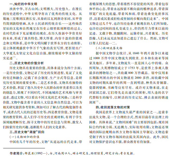 历史文物是一个时代的“见证者”,蕴含着时代气息、传承着文明之美。中华文明之美蕴藏在历史文物中, 让历史文物“开口说话”,可以让人们了解历史、回首过去。因此,博物馆应充分发挥自身的收藏功能、保护功能,使历 史文物不再是单纯的陈列品,而是历史的讲述者、传承者,让全国各族人民尊重历史文物、感受中华文明,成为新时代背 景下中华文明之美的见证者。